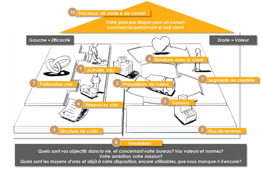 Afin de pouvoir considérer dans sa totalité le modèle d’entreprise des bureaux de consultance financière, j'ai ajouté deux composants essentiels au système de base : la stratégie et les activités journalières de vente et de conseil. Je les considère respectivement comme les fondations et le toit de l'enceinte où doit se dérouler votre activité.